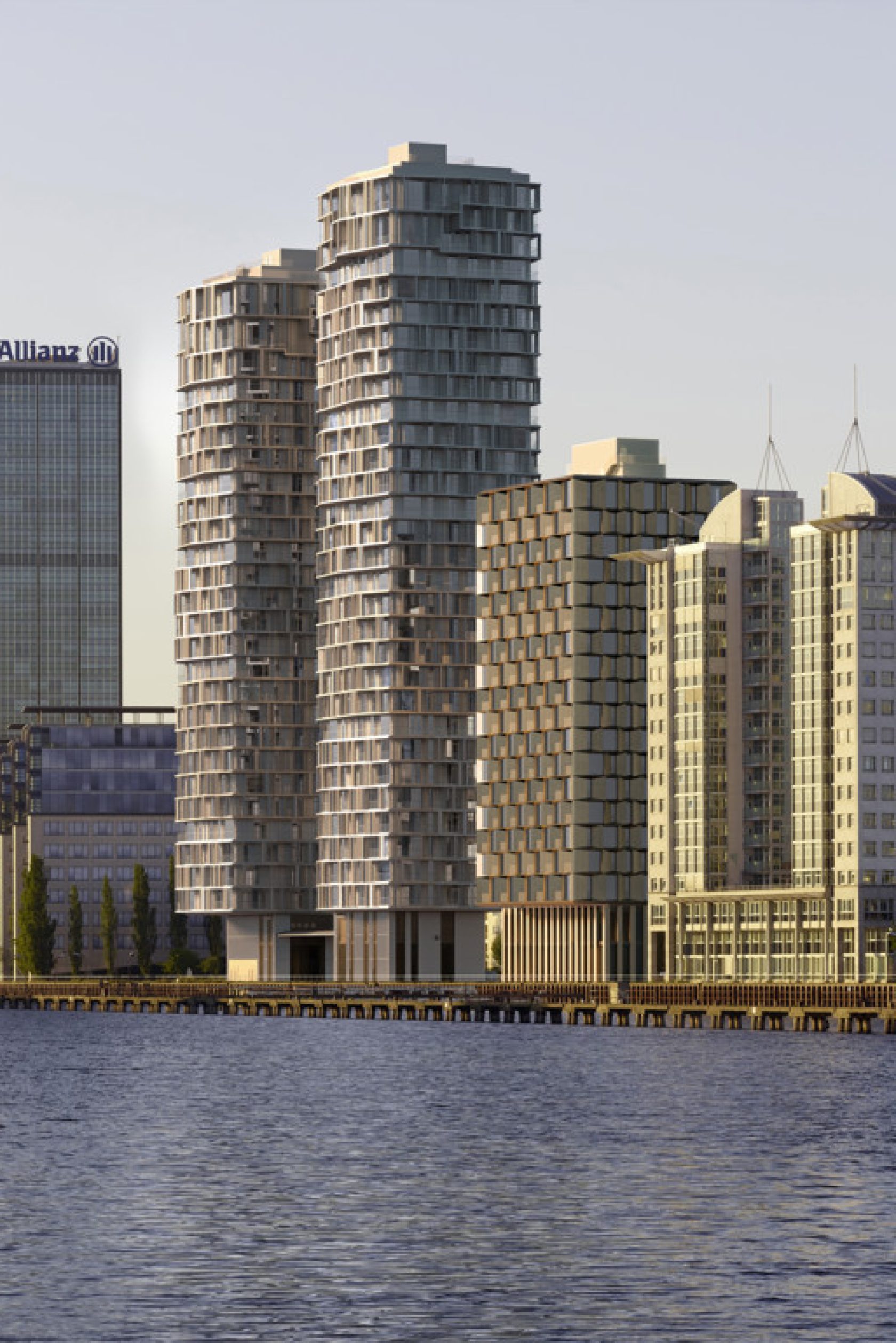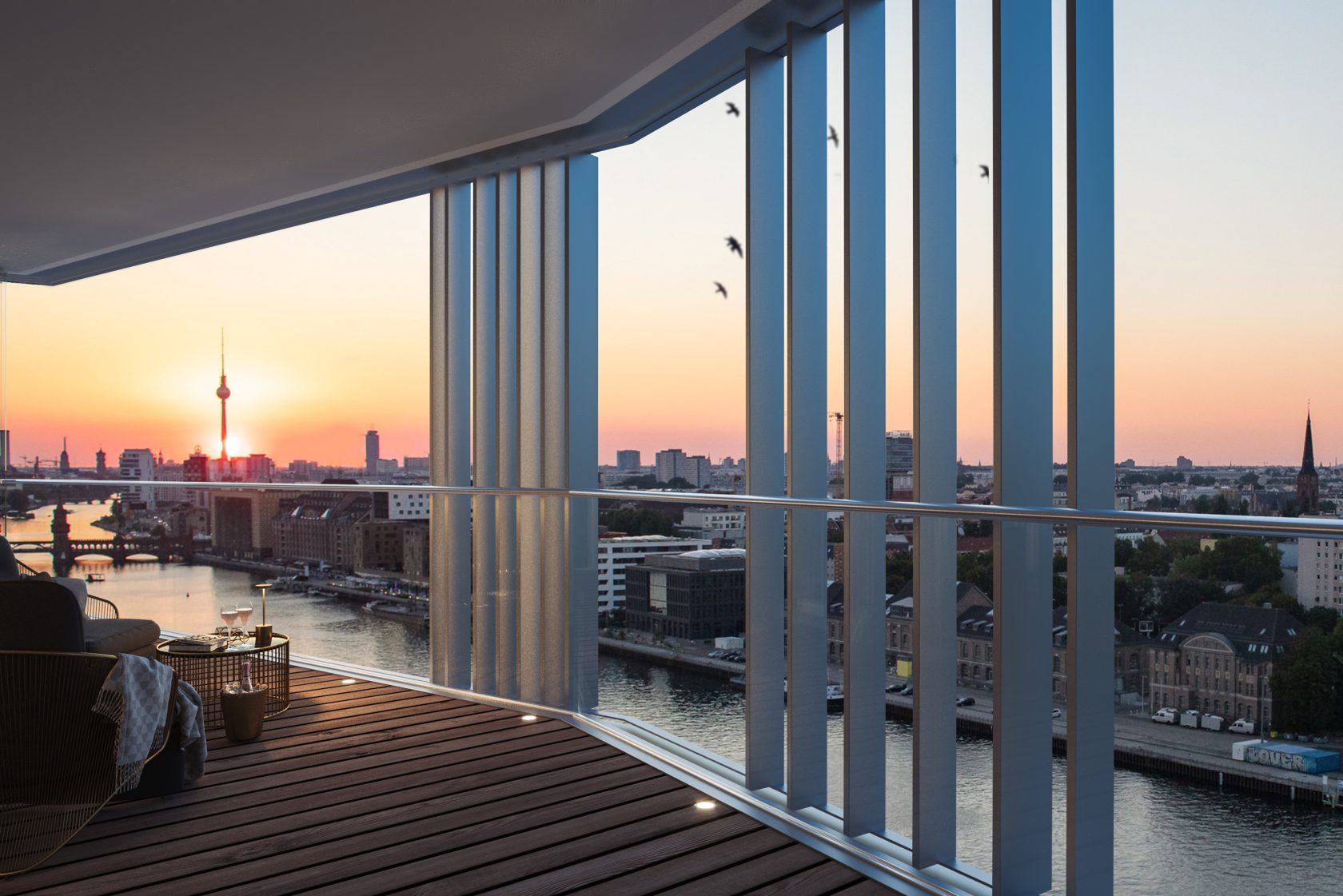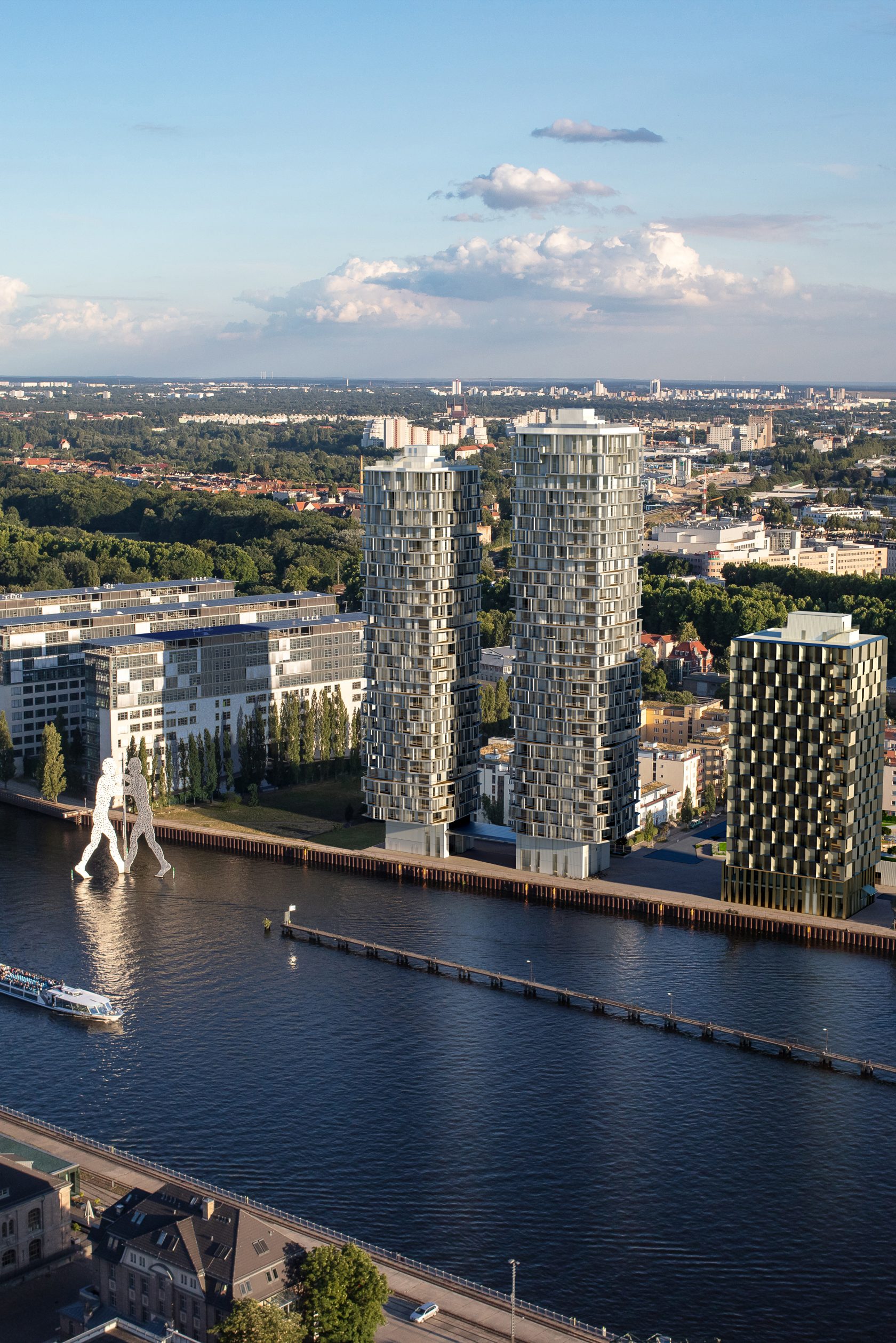 Realisiert werden zwei schlanke Wohntürme und ein Apartmenthotel. Alle Wohnungen haben neben dem Wasserbezug herausragende Blickbeziehungen auf das Berliner Stadtpanorama. Der attraktive Zuschnitt erlaubt eine absolut zeitgemäße Nutzung. Individuell zugeschnittene, großzügige Einheiten sind in den obersten vier Penthouse-Etagen geplant. Hohe Verweilqualitäten werden durch großzügige Terrassen sowie Grün- und Freizeitflächen geschaffen. Ein sich ergänzendes Lebensmittel- und Gastronomiekonzept belebt das Quartier. Die Tiefgarage mit seitlicher Ein- und Zufahrt hält das gesamte Areal komplett verkehrsfrei.